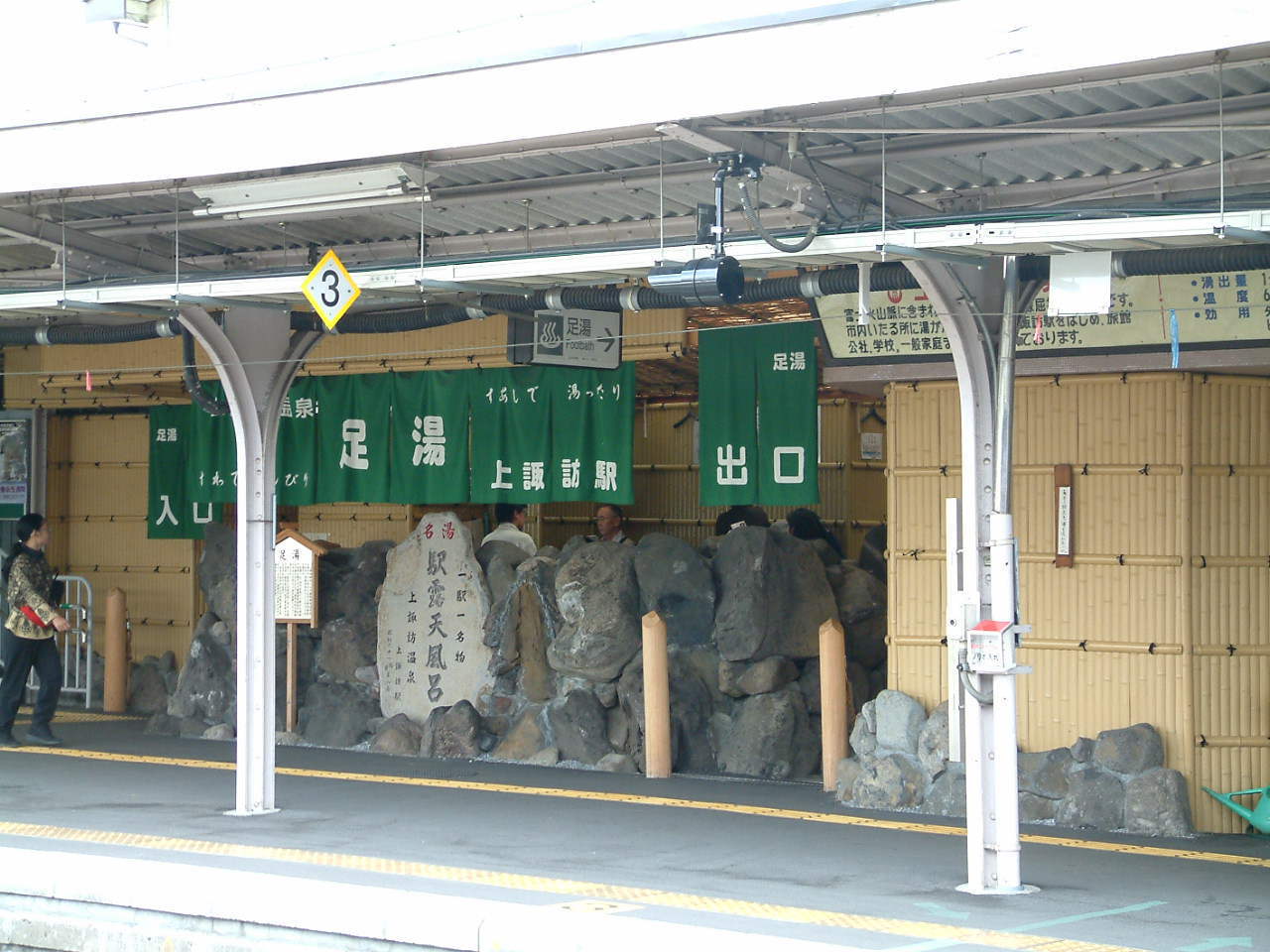 | 上諏訪駅上りホームには、珍しい『足湯』があります。駅露天風呂として人気がある足湯には、列車を待つ人などが多く足湯に浸かっていました。 | |