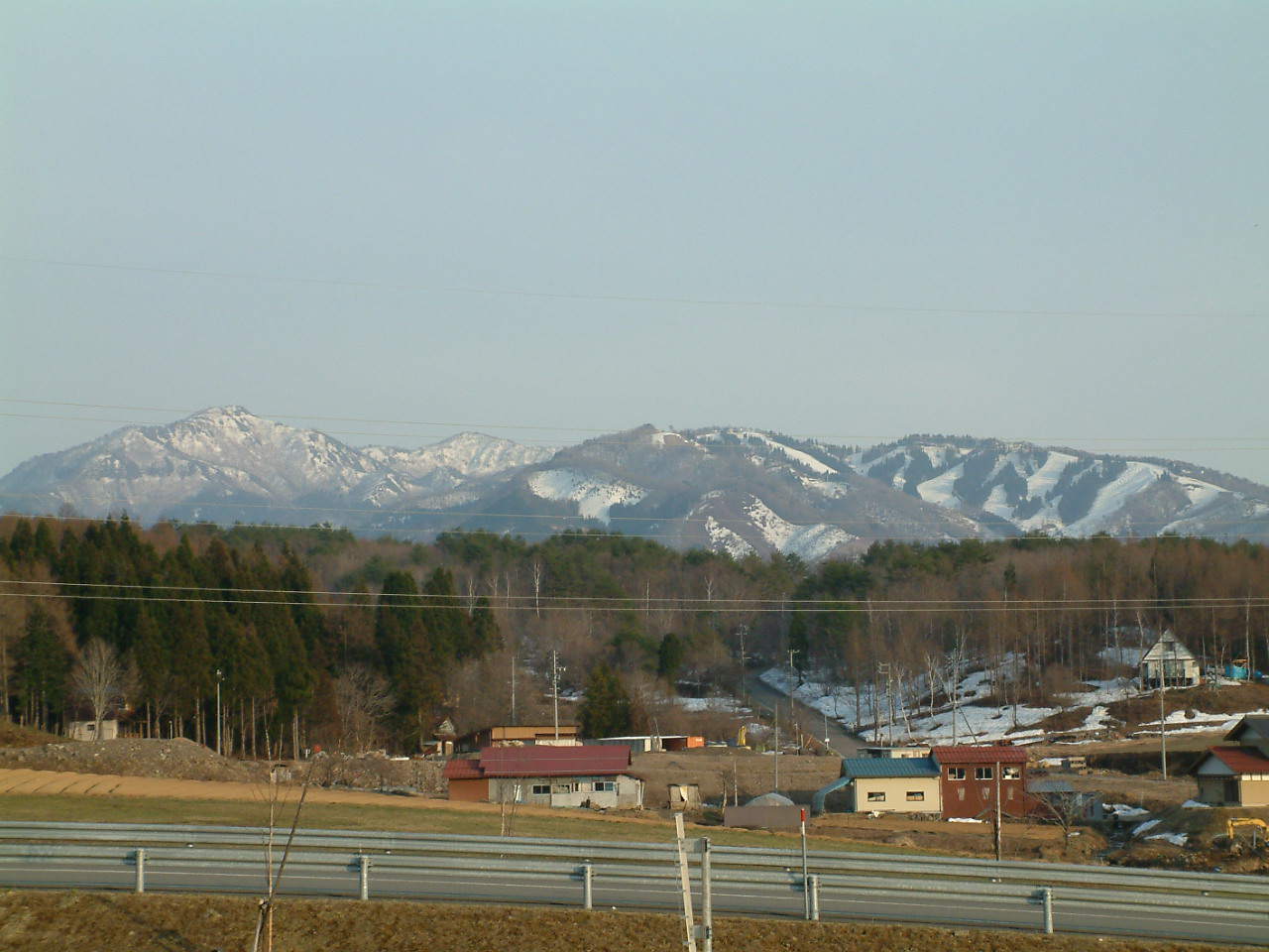 | 駐車場の反対側の景色です。こちらも雪山の山並みが美しい所です。また町にも残雪が残っている様子も分かり、山まで来たと実感した一面でもあります。 | |