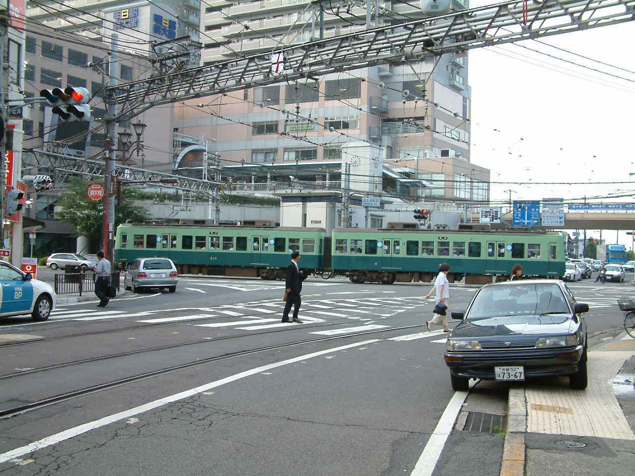 | 写真を写した位置の反対側の写真です。浜大津駅へ向かう石山坂本線が道路の赤信号で停車をしていました。 信号が青になり自動車と共に動き出しましたが、このような光景も面白く見えます。 |