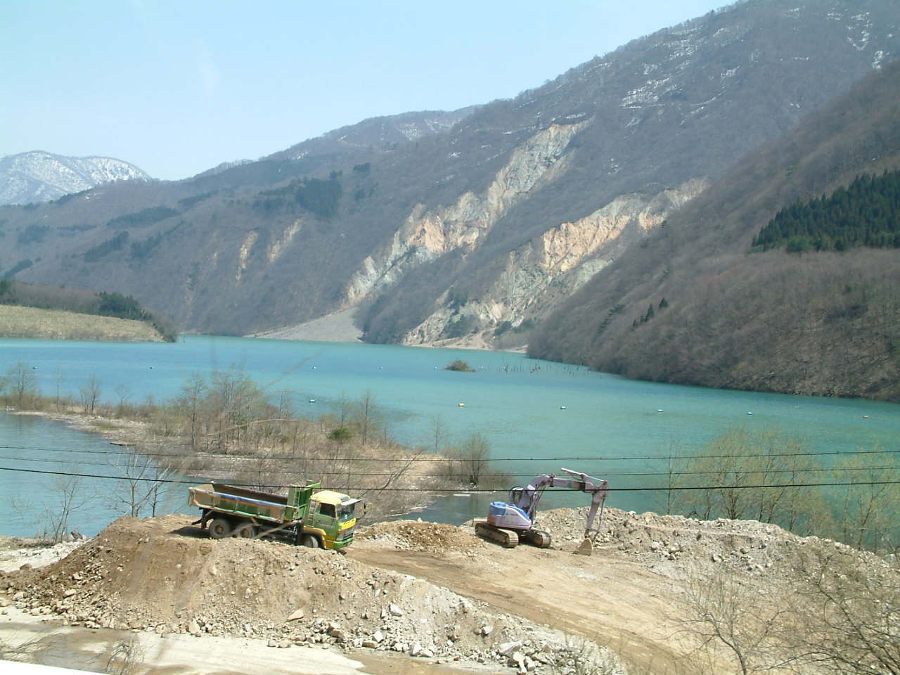 | 先程のダムの貯水湖と思われる湖です。この辺りは遠くの白山などが見えとても景色の良い所です。 工事のトラックなどが一緒に写ったですが、この写真でも自然豊かさが伝わってきます。 |