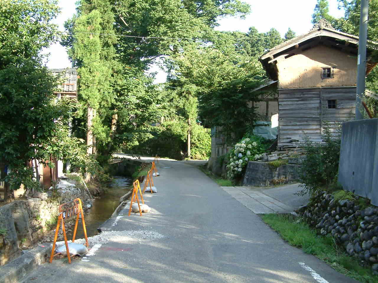 | のどかな田舎道の下田村の道路です。この道路は道路工事中ではなく、道の隣の小川が『新潟集中豪雨』の影響で小川の水位が増して、土手部分の石垣や道路の一部などが削れ、崩れ落ちた部分なのです。 | |