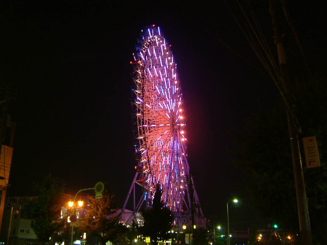 | 天保山ハーバービレッジの近くまで来ました。大きな観覧車がライトアップされて、大阪港の夜をカラフルに演出していました。 | |