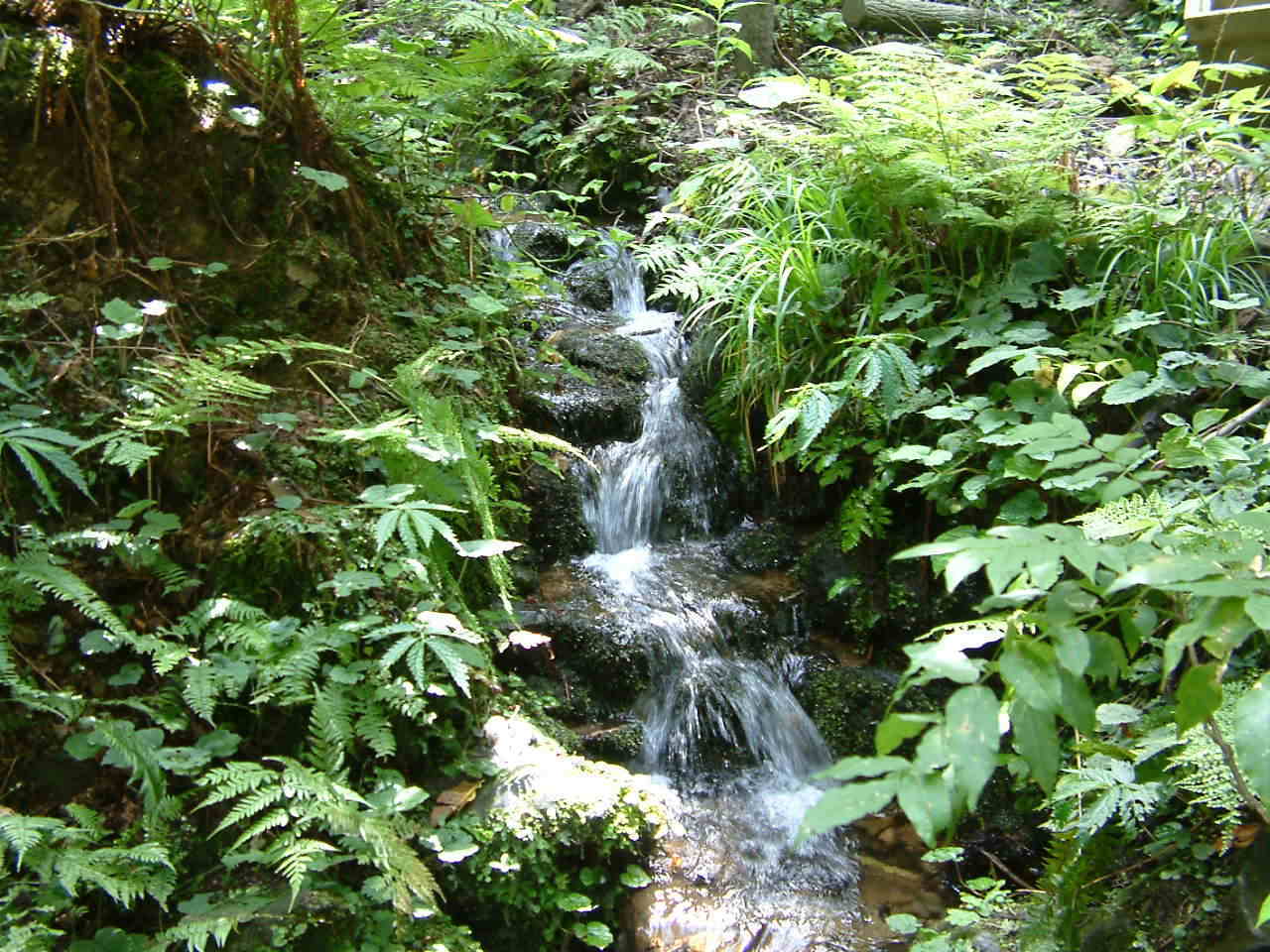 | 小さな小川に純粋な水は、手を入れると夏とは思えないくらい冷たい水で、長い時間手を入れていると凍傷になるくらいの冷たさです。 桶で水をとり、飲んでみました。水道水とは全然違うおいしい水です。 |